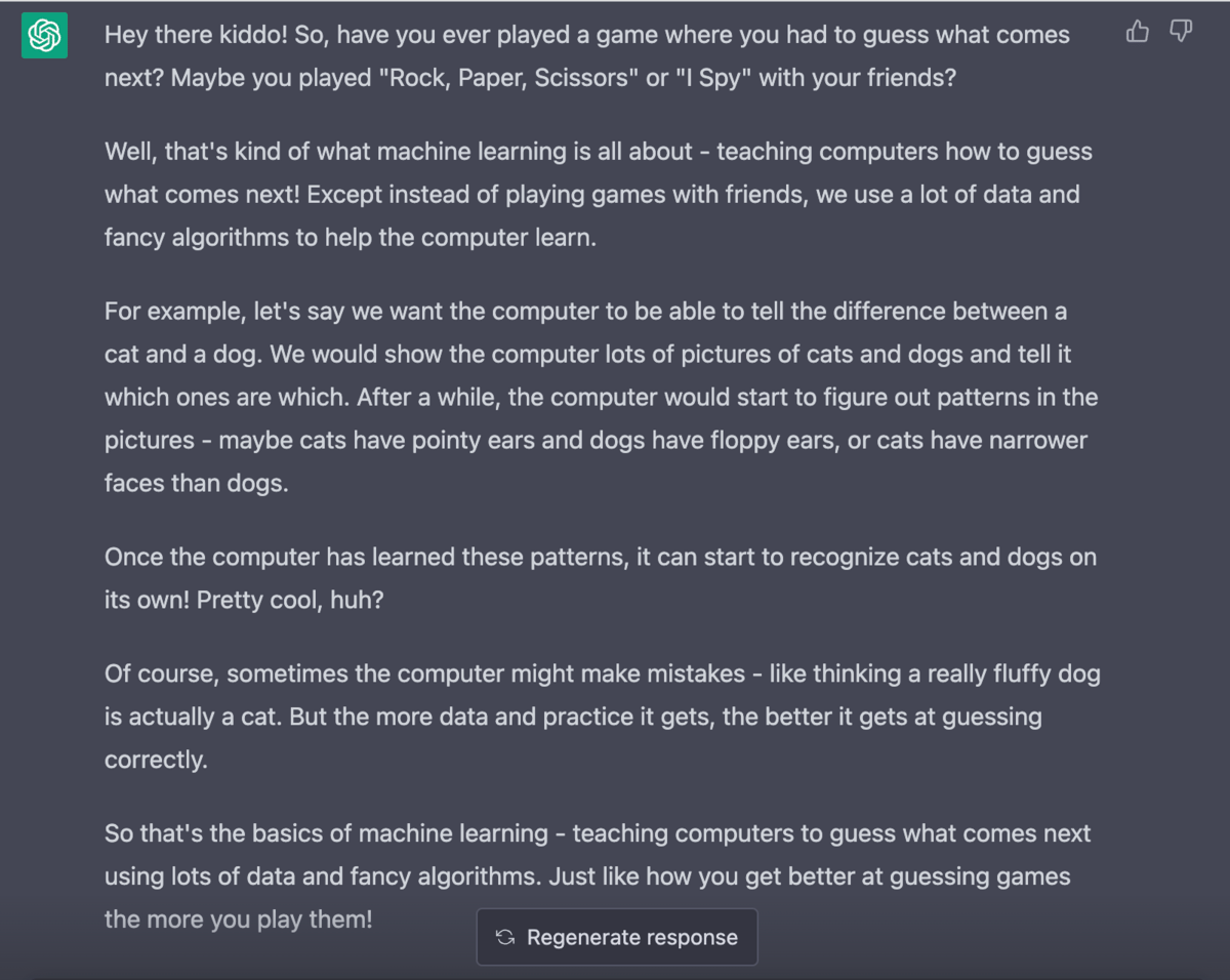 So that's the basics of machine learning - teaching computers to guess what comes next using lots of data and fancy algorithms. Just like how you get better at guessing games the more you play them!